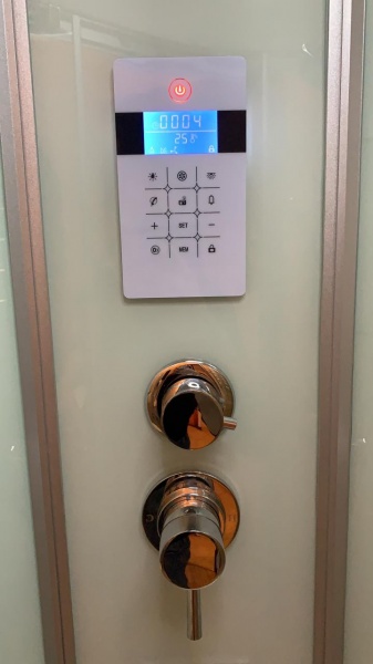 Поддон кабины усилен металлическим каркасом на регулируемых опорах и выдерживает нагрузку до 300 кг. На стенках и центральной стойке, расположились: переключатель и смеситель с керамическим картриджем, сенсерный пульт управления, ручная лейка с самоочищающимися резиновыми джетами, зеркало, сидение в поддоне и просторная полочка для шампуней и гелей. А на крыше, нашёл себе место, широкий тропический душ, диодная лампа, вентилятор и динамик под FM радио.
