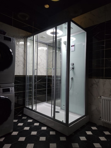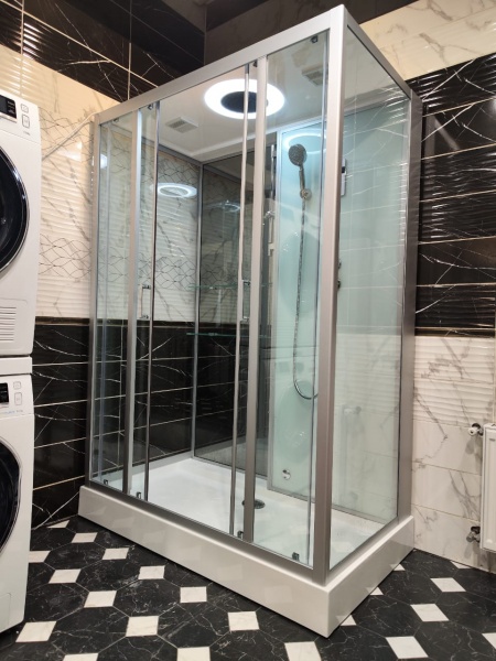 Душевая кабина Frank F507 с паром имеет интересный дизайн, где сочетается белое стекло и зеркальная панель, на которых гармонично расположились две большие полочки под предметы личной гигиены, ручная лейка и сенсорный пульт управления с системой вентиляции и подсветки. Кабина имеет низкий 15-и сантиметровый поддон, усиленный металлическим каркасом, и нагрузка на такой поддон достигает более 300 кг. Стенки и двери кабины выполнены из закаленного ударопрочного 6 миллиметрового стекла, а профиля конструкции из высокопрочного алюминия. В данной модели раздвижные двери. Монтаж осуществляется без герметика, что благоприятно отразится на последующем обслуживании кабины.