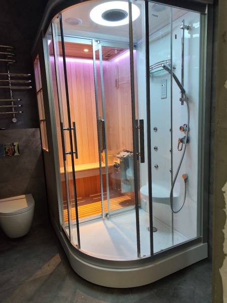 Если Вы хотите организовать настоящую сауну в своем доме, лучший вариант — это душевая кабина, совмещённая с финской сауной от производителя Frank. Она объединяет как обычную душевую кабину, так и сауну. В общем боксе находятся сразу два отделения: одно с душем, другое — с финской сауной. Между отделениями есть дверь, через которую можно пройти, непосредственно, во время процедур.